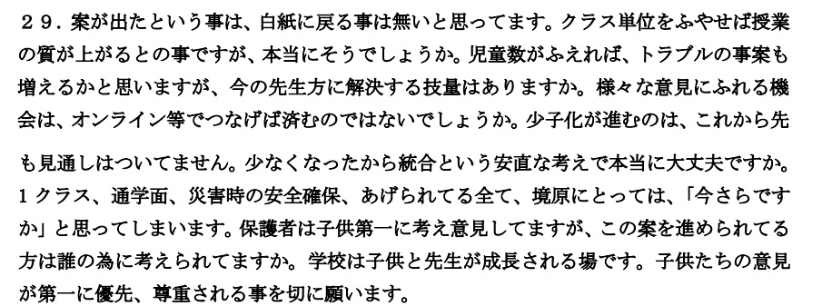 適正規模・適正配置に関しても形だけの検討委員会を設置し、意思決定の過程をブラックボックスにし、住民に相談もせずに計画を進めようとしました。