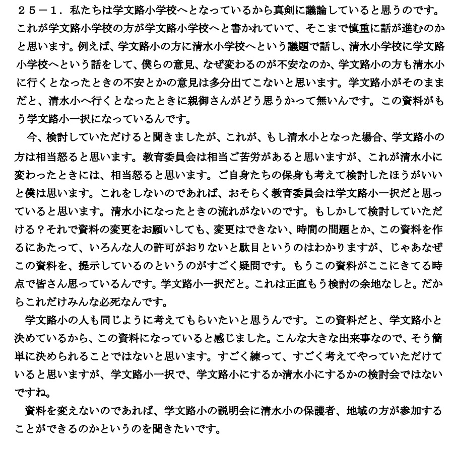 この委員会の約3か月前、市教育委員会は境原小学校の住民説明会で次のような発言を行っています。